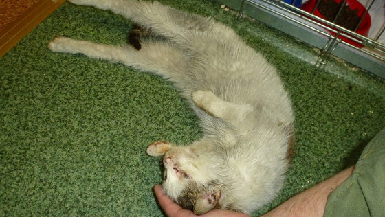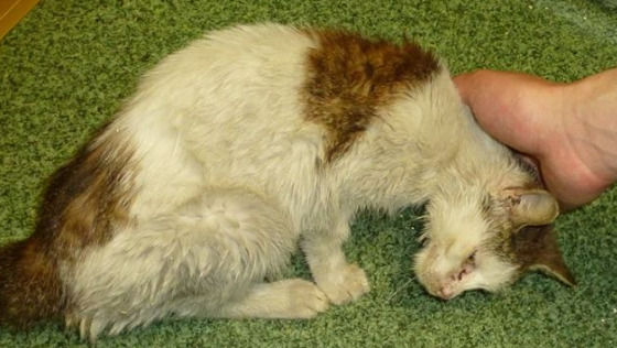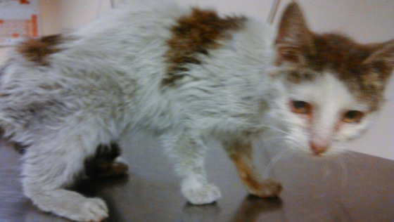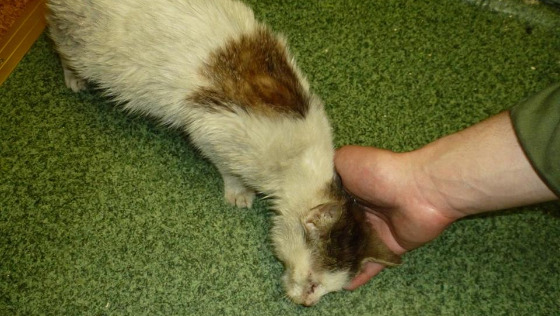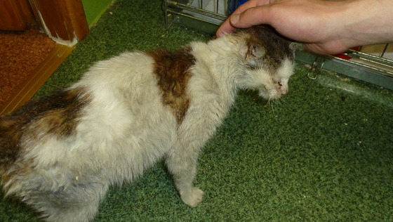 Kotka w wieku około roku, ważąca 1,15 kg. Skrajnie zagłodzona. Prawdopodobnie przez jakiś czas nie mogła się samodzielnie poruszać. W wyniku wypadku, upadku z okna, ludzkiej agresji… nie wiemy co spowodowało uraz, ale malutka ma obtarcia na tylnych łapkach od ciągnięcia ich za sobą i zaniki mięśniowe. Kociczka miała pchły i kleszcze. Cały czas walczymy ze świerzbowcem i kocim katarem. Malutka ma też wrzód rogówki. Cud, że jeszcze nie straciła oczek, a my mamy nadzieję, że uda się te oczko uratować… I jeszcze jedna, najgorsza rzecz – kociczka została przez jakieś zwierzątko pogryziona… To miziaste kociątko, cierpliwie znosi zabiegi, przytula się. Domowy kotek. Kolejny, który jakoś dom stracił i nie dał rady na ulicy. Światełkiem w tunelu jest to, że kotka ma ujemne testy na choroby zakaźne. Jest poważanie niedożywiona i odwodniona.