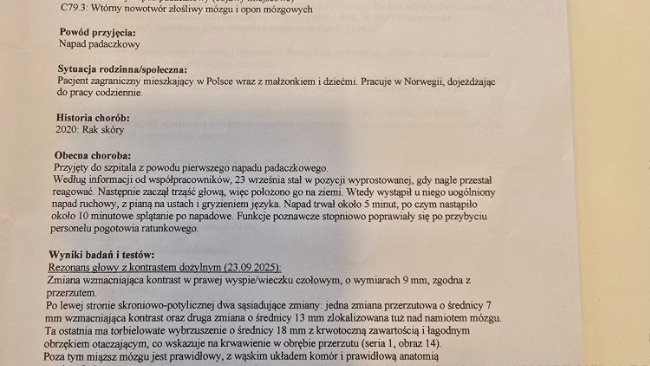 Damian już raz walczył z nowotworem- czerniakiem. Myśleliśmy ze wygrał tą walkę. Ale 23 września zapamiętam do końca życia o 3 w nocy obudził mnie telefon, mąż w pracy stracił przytomność i miał atak padaczkowy trwający 5 minut. Karetka zabrała go do szpitala a ja jeszcze wtedy myślałam ze to przemęczenie. Szpital w Bergen ze względu na historię onkologiczna zdecydował się wykonać rezonans który wykazal aż 3 zmiany w mózgu, które są przerzutem czerniaka. Mąż postanowił wrócić do Polski aby tu poddać się leczeniu i być blisko Nas. Znaleźliśmy lekarza który podjął się operacji wycięcia największej zmiany która na domiar złego wykazuje aktywne krwawienie. Potem czeka go konsylium onkologiczne, radioterapia i najprawdopodobniej imunnoterapia oraz rehabilitacja.