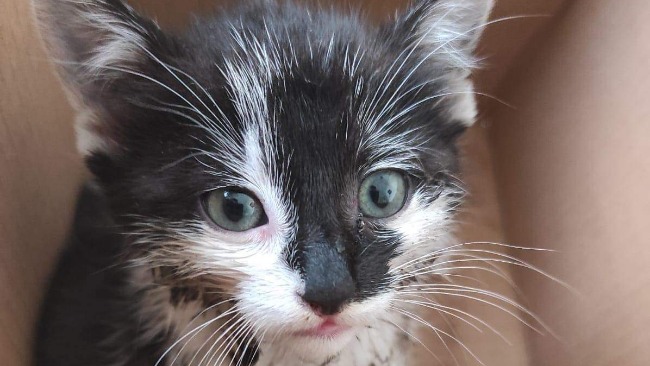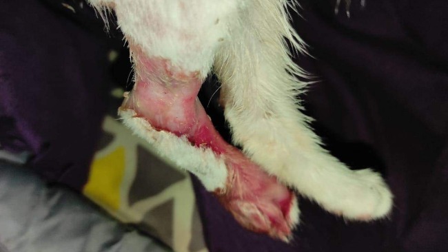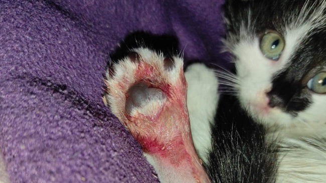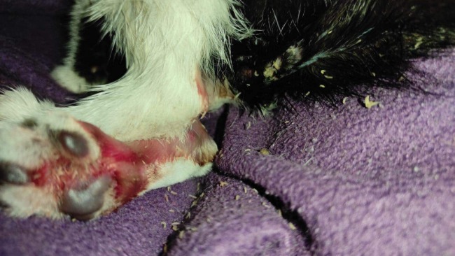 Mała ma około 7-8 tygodni. Prawdopodnie tylną łapkę trzeba będzie amputować, jest oskórowana, zimna i nie ma w niej czucia.