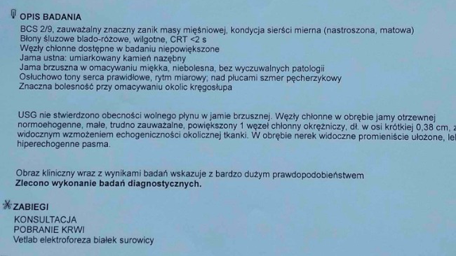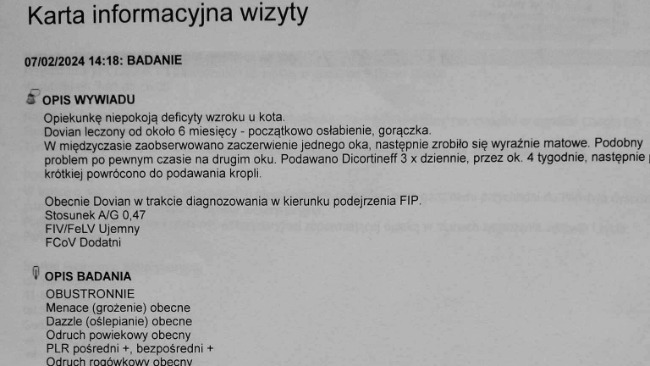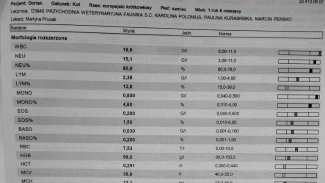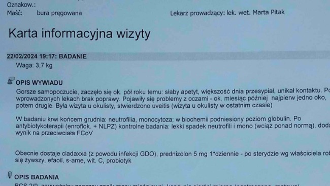 Witam wszystkich. Prosimy Was o pomoc w leczeniu naszego Doriana, dwuletniego kotka. Już jako młody kociak długo chorował na koci katar i mieliśmy nadzieję, że po tym już wszystko będzie w porządku, jednak od jakiegoś czasu Dorian stał się bardzo smutny i tylko spał, nie miał apetytu, miał bardzo wysoką gorączkę. Udaliśmy się do weterynarza, aby dowiedzieć się co mu dolega. Już pierwsze badania wykazały bardzo silny stan zapalny całego organizmu, dlatego lekarz zalecił leczenie antybiotykiem. Po kilkumiesięcznym leczeniu stan zapalny zamiast się poprawić poszerzył się o problemy ze wzrokiem. Odbyliśmy konsultację z okulistą, która potwierdziła stan zapalny w oczach Dorka, a każda kolejna wizyta utwierdzała podejrzenie ciężkiej choroby - KOSZMARNA DIAGNOZA - zakaźne zapalenie otrzewnej (poniżej załączone wyniki badań). Podjęliśmy więc walkę o jego życie. Jest on po pierwszych dawkach leku, który poprawił jego stan na tyle, że powoli zaczyna normalnie funkcjonować. Niestety pełne leczenie jest drogie i trwa około 3 miesięcy, przerasta to nasze możliwości finansowe, więc nie damy sobie rady sami. Dlatego prosimy Was o pomoc i wsparcie. Każda złotówka jest na wagę złota! Błagamy, nie bądźcie obojętni! Zawalczcie z nami o życie naszego członka rodziny.