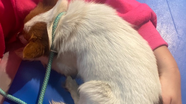 2 psy mieszance kundelka i pinczerka ważące około 4 kg, samiec i sunia. Podejrzewamy ,,odpady” z jakiejś pseudohodowli. Dostaliśmy zgłoszenie, że jeden z nich ma coś dziwnego przy szyi. Pojechaliśmy na miejsce. Co się okazało: właściciel wziął je do siebie, cutuję,, aby odstraszały lisy bo kury….” Psy bały się własnego cienia, a lis miałby je na jeden kęs. Niestety najgorsze okazało się później. Samiec ma ropiejącą ranę otwartą a spowodowane było to wrastającym, ciasnym sznurkiem na szyi. Po odłowieniu trafił od razu do weterynarza.