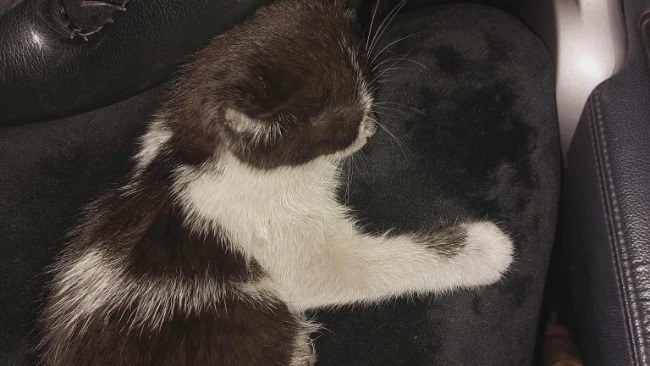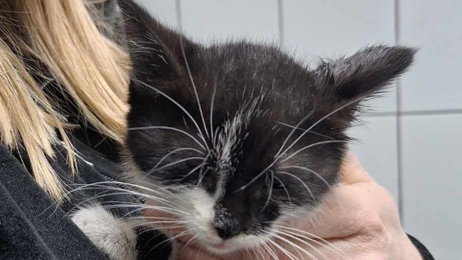 Koteczka ma około 2 miesiące. Została zabrana do weterynarza, gdzie wykonano testy Fiv/Felv, zbadano kał na obecność pasożytów, rozpoczęto leczenie świerzbu usznego. Wdrożone też muszą być leki w kierunku eliminacji toksokarozy, która wyszła z badania kału.