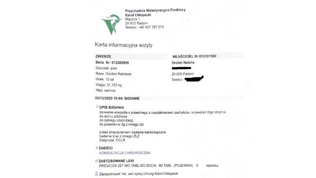 Dołączamy z mamą dokumentację z ostatniej wizyty u weterynarza. Po wykonanej operacji dołączę dokumenty potwierdzające jej wykonanie.