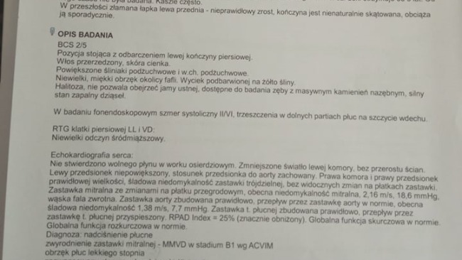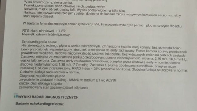 Po wczorajszej wizycie u weterynarza u Miki zdiagnozowano nadciśnienie płucne, obrzęk lekkiego stopnia, oraz zaawansowany stan zapalny dziąseł i ślinianek. Tego dnia wykonaliśmy jej zdjęcie RTG 2, oraz konsultacje kardiologiczną z badaniem echo. co było już dla nas sporym kosztem. Od wczoraj przyjmuję zastrzyki, a od dzisiaj również syrop i tabletki Clavaseptin. Na dzisiejszej wizycie została pobrana jej krew, w celu określenia dawki znieczulenia przeznaczonej na ekstrakcję. Na poniedziałek/wtorek szacowany jest termin ekstrakcji zębów, dzięki czemu Mika będzie mogła bezboleśnie jeść. Zapobiegnie to również rozprzestrzenianiu się bakterii z jamy ustnej do krwioobiegu. Bardzo proszę o wsparcie i dziękuje wszystkim, którzy w jaki kolwiek sposób pomogą Mice w trudnych dla niej chwilach.