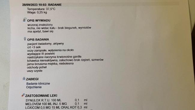 Maleńka jest już po wizycie u weterynarza. Oficjalnie więc zaczynamy walkę o tę 250 gram czystej słodyczy! Maleńka je już sama. Ma zaawansowany koci katar i zapalenie gardła. Dzisiaj została odpchlona i odrobaczona.