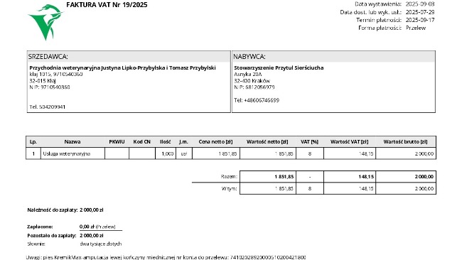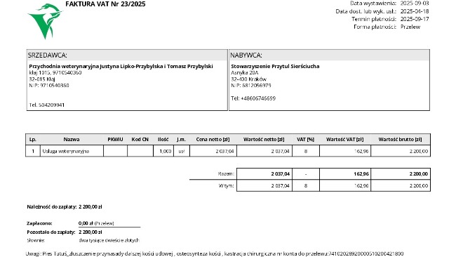 Załączone FV to tylko oplaty z jednego gabinetu. Te kwoty musimy spłacić jak najprędzej. Kolejne koszty z innych gabinetów oraz za karmę, leki, rehabilitację i wizyty to rząd kolejnych kilkudziesięciu tysięcy złotcyh.