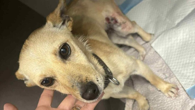 Fot. Diego po przybyciu do Przystani-cierpiący, obolały, z urazem łapki. Wg specjalisty ciepiał wiele miesięcy.