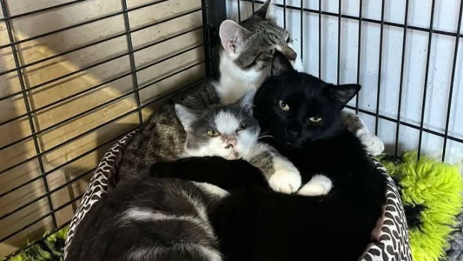 Fot. Czarny kotek Heliosek zaprzyjaźnił się z dwoma kotkami w kociarni. Uwielbiają tak razem leżec przytuleni <3