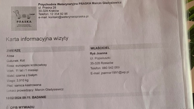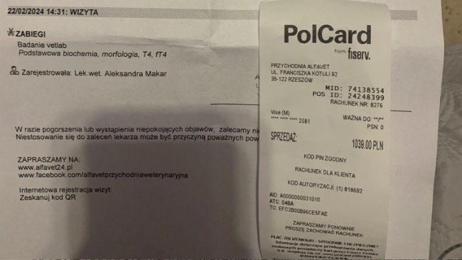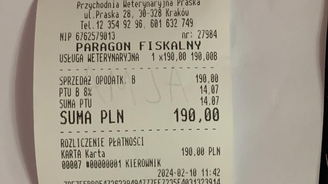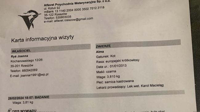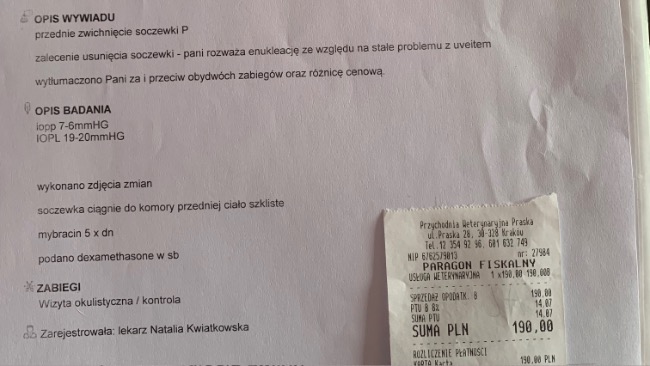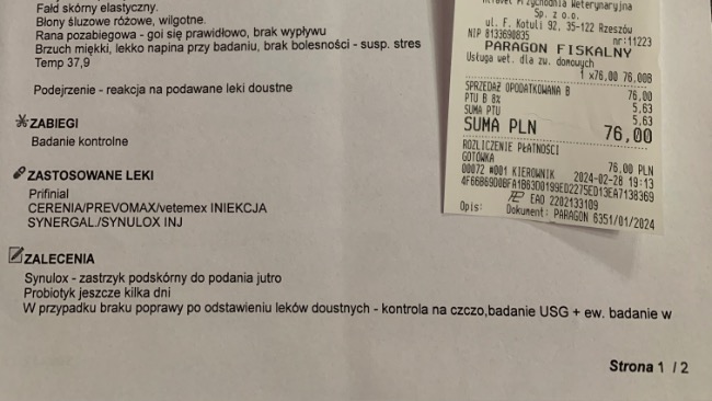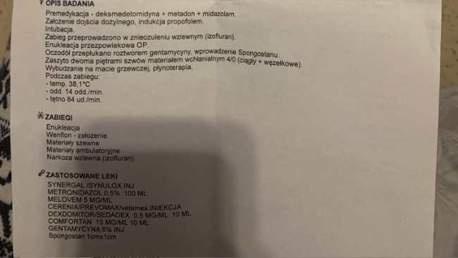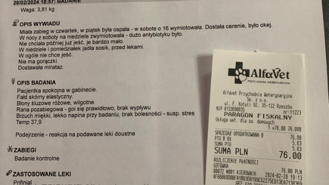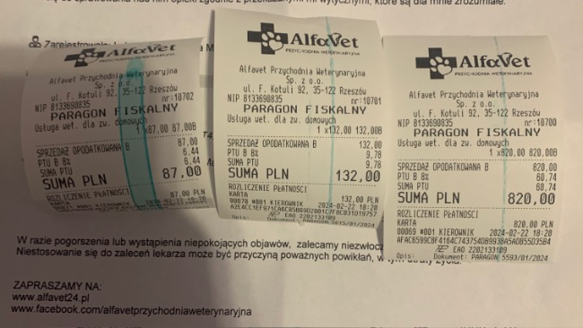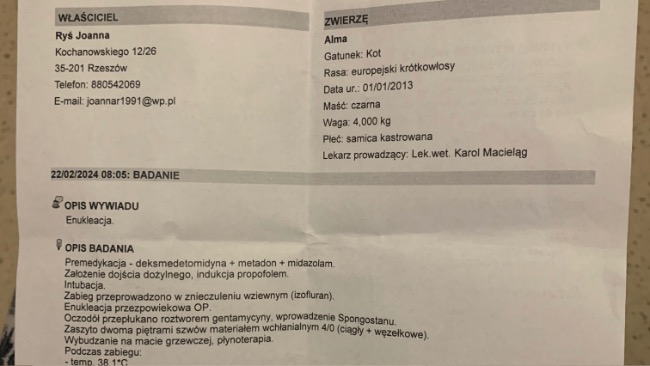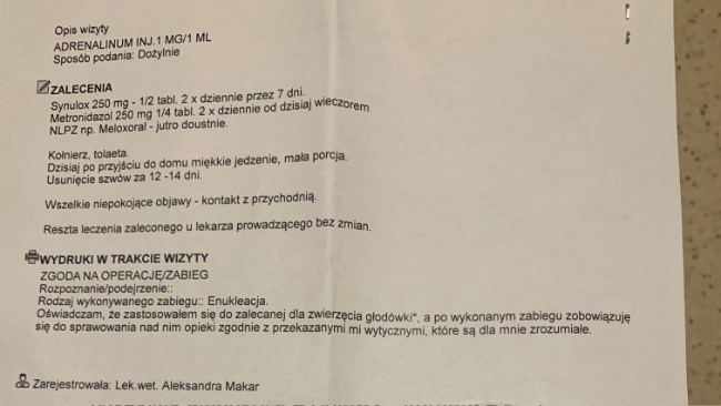 Alma przeszła zabieg pomyślnie. Dostała leki do domu i za 2 tygodnie jest zapisana na ściąganie szwów. Za całość wyszło 1039 zł.