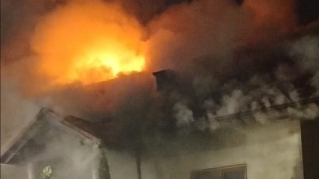 Zniszczony dom po pożarze, z uszkodzoną dachówką.