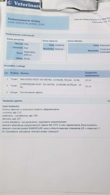 Podczas ostatniej wizyty stomatologicznej (04.02.2026 r.), co potwierdza załączone zdjęcie oraz karta informacyjna, stwierdzono znaczne zdegradowanie koron zębowych, liczne zęby ruchome, w tym m.in. ruchomy ząb 110, połamany ząb 109 oraz złamany ząb 307. Obecne są również liczne diastemy, które zostały oczyszczone i wypłukane antybiotykiem, jednak problem ma charakter zaawansowany .Lekarz weterynarii jednoznacznie zalecił pilną ekstrakcję występujących zębów, aby zapewnić Zicie komfort oraz ograniczyć ból i stan zapalny w jamie ustnej. Pomimo stosowania odpowiedniej diety, trawokulek oraz częstych posiłków, klacz nie wykorzystuje prawidłowo paszy, a jej kondycja nie ulega poprawie. Trwający stan zapalny w pysku dodatkowo pogarsza jej stan ogólny.