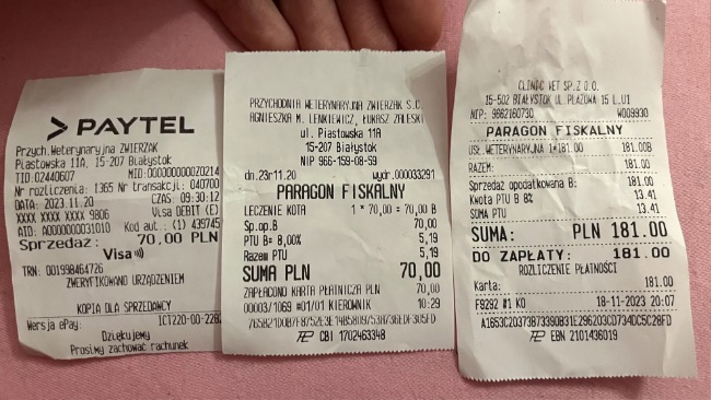 Witamy:) Z góry przepraszamy za tak długi brak aktualizacji z naszej strony ale woleliśmy poczekać z informacjami aż Floruś przyjmie więcej dawek surowicy oraz innych leków. Od poniedziałku jesteśmy w lecznicy codziennie (a czasami nawet dwa razy dziennie) aby Florek mógł dostawać surowicę, antybioty, steryd oraz płyny. Największą różnicę w samopoczuciu Florka zobaczyliśmy po podaniu mu leku Accofil który ma za zadanie pobudzić produkcję białych krwinek( panleukopenia bardzo upośledza szpik kostny a co za tym idzie białe krwinki). Jak narazie weterynarze nie są w stanie zapewnić nas na 100% że Florek przeżyje:( Ale nadeszły ogromne zmiany! Stał się dużo bardziej aktywny, wczoraj udało nam się wcisnąć w niego 40ml pokarmu (najwięcej od piątku), udało mu się zrobić normalną kupkę co świadczy o tym,że jego jelita pracują :), dużo więcej chodzi a nawet korzysta z kuwety i przychodzi na kolanka<3 Dwójka jego starszego rodzeństwa dostała szczepienie przypominające i miejmy nadzieje że są bezpieczne (Floruś jest oczywiscie w kwaratannie). W tym tygodniu na same wizyty wydaliśmy 417 złotych i dużo dołożyliśmy ze swoich kieszeni. W grę wchodzą niestety jeszcze dojazdy,ponieważ nie posiadamy samochodu nasza rodzina i przyjaciele starają się nam pomagać w tej kwestii jak tylko mogą ale same przejazdy boltem wyniosły nas 170 złotych (od soboty). Z tego względu zbiórkę pozostawiłam otwartą bo nie dostaliśmy jednoznaczej odpowiedzi co dalej:( Floruś dalej nie je samodzielnie i schudł 100 gram od soboty,ale miejmy nadzieje że z każdym dniem będzie tylko lepiej:) Jesteśmy OGROMNIE wdzięczni za tak szybki odzew i jeszcze bardziej wzruszeni że mamy tyle dobrych serduszek wśród naszych znajomych. Dziękujemy wam raz jeszcze razy milion bo to dzięki waszej pomocy jestemy w stanie zająć się Floriciem jak najlepiej sie da. Załączam zdjęcia paragonów (chciałam również dodać zdjęcie Florcia ale da się tylko jedno)