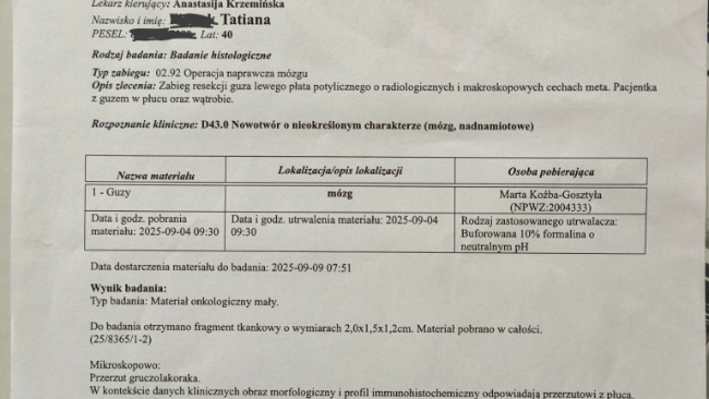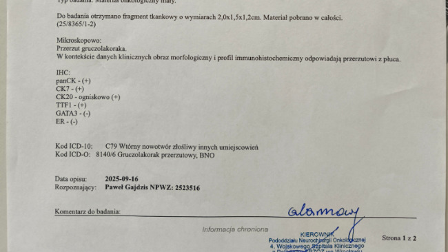 Z powodu naglej utraty władzy w prawej stronie ciała i zaburzeniu widzenia, trafiłam na SOR z podejrzeniem udaru. Lecz po badaniach okazało się że mam guz w mózgu który był już przerzutem z płuca. Konieczna była natychmiastowa operacja. Guz w płucu jest nie operacyjny (gruczolakorak IV stadium). Po wykonaniu badania PET okazuje się że rak rzutuję szybciej niż bym tego chciała. W mózgu znaleziono dwa nowe ogniska w płacie skroniowym oraz w móżczku. Wzrósł poziom trójglicyrydów do ponad 22000 gdzie norma to 150, który dał rzut do trzustki. Przez to doszła jeszcze i cukrzyca.