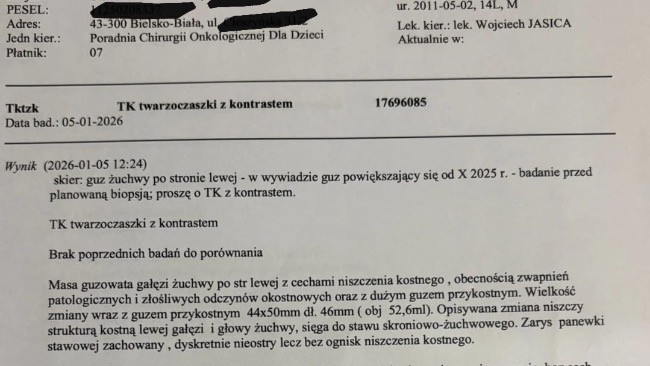 Nazywam się Michał, mam 14 lat, pochodzę z miejscowości Bielsko-Biała na śląsku. Jeszcze nie dawno byłem zwyczajnym nastolatkiem-chodziłem do szkoły, śmiałem się z kolegami, miałem marzenia i plany na przyszłość. Nie myślałem o chorobie. Nie myślałem o strachu. Myślałem, że mam całe życie przed sobą. Pod koniec 2025 roku wszystko runęło w jednej chwili. Przyjęto mnie do szpitala problemami żuchwy lewej, gdzie narośl na moim lewym policzku z dnia na dzień się powiększała, okazało się po badaniach, że mam guza ta informacja była dla mnie wyrocznią, a moje codzienne życie i moje marzenia przepadły jak grom z jasnego nieba. Nowotwór, który mnie zaatakował okazał się nowotworem złośliwym. Masa guzowata zaatakowała układ kostny żuchwy, obecność zwapnień patologicznych i złośliwych odczynów kostnych, oraz dużym guzem przykostnym. Wielkość zmiany wraz z guzem przykostnym 44x50mm dł. 46mm (obj. 52,6ml). Opisana zmiana niszczy strukturę kostną lewej gałęzi i głowy żuchwy, sięga do stawu skroniowo-żuchwowego. Robiono badania, kolejne badania... aż w końcu padły słowa, które odebrały mi oddech: złośliwy nowotwór żuchwy-mięśniak. Guz ma prawie 5 cm. Rośnie. Zabiera mi zdrowie i dzieciństwo i poczucie bezpieczeństwa. Mam 14 lat.... a muszę walczyć o życie. Każdy dzień to strach. Strach przed bólem. Przed leczeniem. Przed tym, co będzie dalej. Patrzę w lustro i widzę chorobę a nie chłopaka, którym byłem jeszcze chwilę temu. Moje marzenia zostały brutalnie przerwane, ale wciąż jedno we mnie żyje- chce żyć. Chcę wrócić do szkoły, chcę smiać się bez bólu i lęku. Leczenie, które może mnie uratować jest bardzo skomplikowane i kosztowne. Opracje, specjalistyczna terapia, rehabilitacja-bez pomocy ludzi o dobrych sercach, ponieważ Moja rodzina nie jest w stanie tego udzwignąć. Każda złotówka to dla mnie szansa. Każde udostępnianie to nadzieja. Każda modlitwa to siła, której tak bardzo potrzebuje.