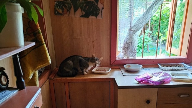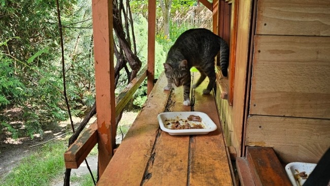 Codziennie niezależnie od pogody jedzie autobusem na działkę, bo wie że głodne koty czekają na nią. Zimą specjalnie podgrzewa im karmę i jedzie z termosem.