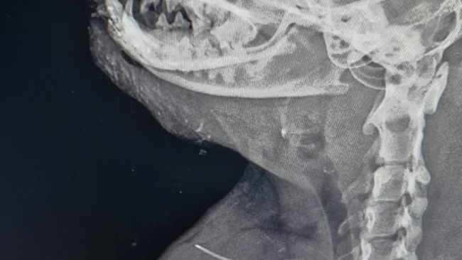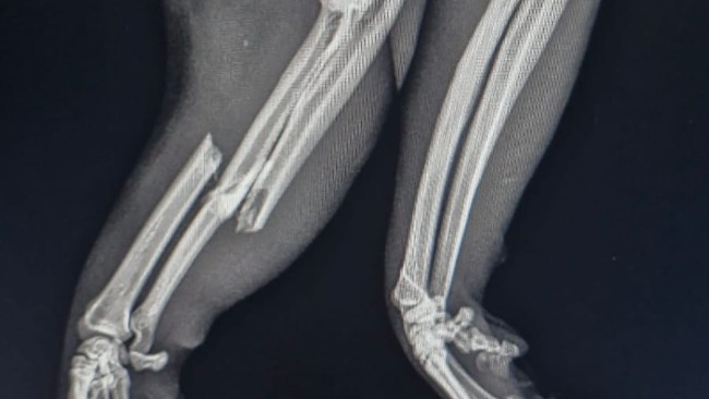 Zdiagnozowano złamanie kości przedramienia prawego i spojenia żuchwy. Usg jamy brzusznej nie wykazało odchyleń od normy. Kot został zabezpieczony przeciwbólowo i czeka na zabieg osteosyntezy.