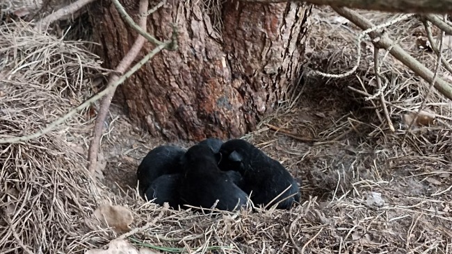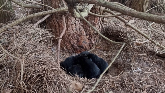Mała wystraszona suka i gromada czarnych jak smoła szczeniąt. Jeszcze ślepych.