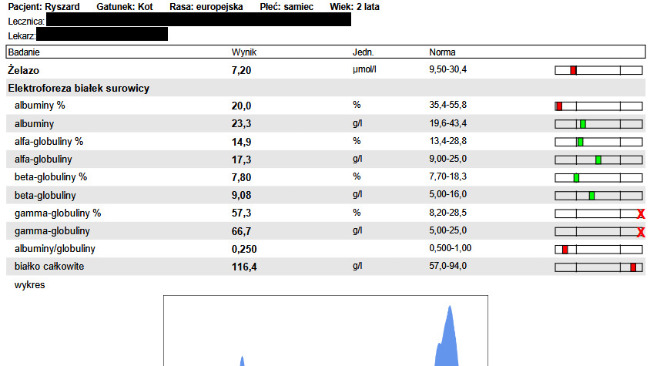 Rozpoczęliśmy diagnostykę. Wyniki badań zaniepokoiły lekarza – bardzo wysoki poziom białka całkowitego, niski stosunek albumin do globulin, ogromne stężenie gamma-globulin i alarmujący stan zapalny w organizmie.