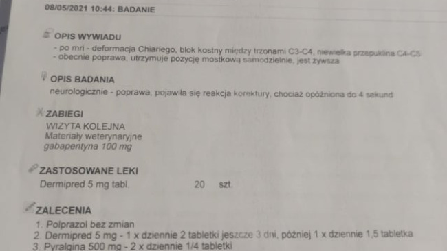 Rezonans wykazał deformacje Chariego, blok kostny między trzonami C3-C4, niewielką przepuklinę C4-C5. Nika dzięki pomocy specjalistów odzyskała sprawność, wreszcie mogła stanąć na 4 łapy.