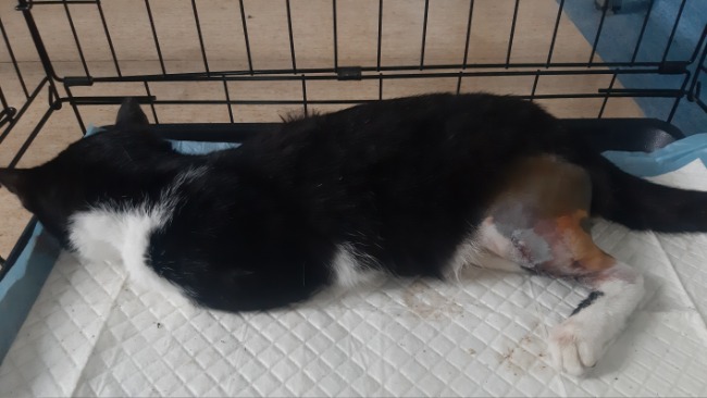 Poniedziałek, dzwoni teflon z prośbą o pomoc dla kota po wypadku. Z informacji uzyskanych od zgłaszającego wynikało, że kota potrącił samochód , który odjechał zostawiając Go na pastwę losu. Nie zastanawiając się ani sekundy , bez planu za co zapłacę w lecznicy, za co utrzymam kota, jadę po biedę !Ona może liczyć tylko na mnie 😔. W lecznicy RTG wykazało złamanie kości piszczelowej.