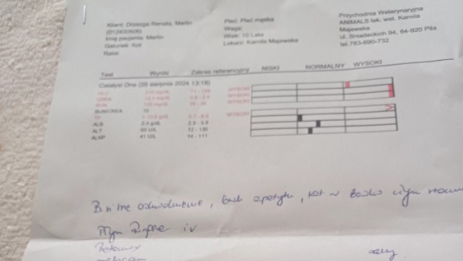 Moi Drodzy ❤️, Merlin to kot porzucony na pewne osiedle, może mieć ok.10 lat ,porzucony prawdopodobnie z powodu choroby 💔,bdobra istota z sercem pochyliła się nad nim i zabrała do siebie. Niestety osoba ta mieszka na działkach i żyje z głodowej renty😢, ma pod opieką 5 kotów. Merlin przestał jesc , stał się osowiały i siusial pod siebie 😢. Zwróciła się do mnie o pomoc, mimo, że nie mogę już ratować kotów, z powodu braku miejsca i funduszy, zdecydowałam się pomoc. Zabrałam Merlina do weta, zrobiono badania, okazuje się, że choruje na przewlekła niewydolność nerek 😭. Walczymy, robie co mogę, ale muszę poprosić Was o wsparcie i wierzę, że pomożecie uratować życie Merlina 🙏🆘. Jest w trakcie leczenia, ale potrzebne będą znów badania, potrzebna jest karma Renal 🆘. Za każdą wpłatę z serca dziękuję i każda, nawet najmniejsza szanuje jednakowo. Proszę pomóżcie, udostępniajcie i zapraszajcie znajomych🆘. Ja zrobię wszystko, żeby żył i nie cierpiał 😢