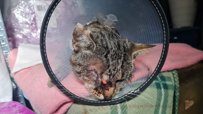 Kotek Gapcio po zabiegu usunięcia gałki ocznej.