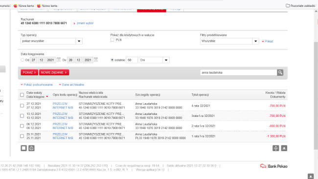 Aktualizacja 13 lutego 2022 r. Zapłaciłyśmy doktor Laudańskiej część faktur. Załączamy screeny z wpłat. Mamy jeszcze nie zapłaconą fakturę 44/2021 2704 zł z października i z listopada 3153,60 zł w sumie pona 5800 zł.