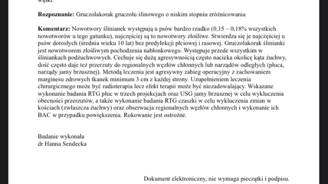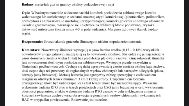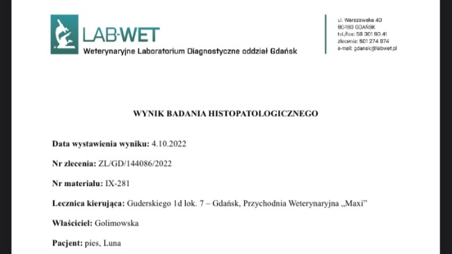jestem Patrycja i zbieram pieniądze dla mojego pieska, który jak się okazało po wielu badaniach ma złośliwego raka ślinianki z przerzutami. Pieniądze, które uda mi się zebrać przekażę na leczenie Luny. A historia z chorobą Luny zaczęła się w Maju tego roku (2022). Wtedy zauważyłam u Lunki mały guzek z lewej strony szyi. Guzek zaczął rosnąć więc już w połowie maja poszłam do weterynarza. Początkowo stwierdzili, że jest to zapalenie i zostały przepisane nam leki, które działały tylko chwilowo. Tydzień później znów poszłam do weterynarza i znów dostała tylko leki. I podawanie samych leków ciągnęło się do Sierpnia, a guzek rósł co raz bardziej. W lipcu dostaliśmy skierowanie na badanie RTG, z którego wyszło, że jest to nowotwór lub zapalenie. I już w tamtym momencie się załamałam, ponieważ domyślałam się jak bardzo to wszystko będzie kosztowne, a bardzo chcę pomóc mojemu psu. Następnie przez połowę lipca luna brała kolejne leki. I na tamten moment koszt leczenia wynosił ok. 2500zl. Natomiast we wrześniu nastąpił przełom gdzie zrobiliśmy masę badań, na których wykazano iż jest to nowotwór, ale jeszcze nie było wiadomo jaki. I tak do połowy września luna znów została na samych lekach. 19.09.2022 był to dzień, który był przełomowym dniem. Luna tego dnia miała robione USG na którym wyszło, że może to być nowotwór tarczycy, a chwilę później zapadła decyzja na temat szybkiej operacji, ponieważ guzek się powiększał przez co Lunce co raz ciężej się oddychało. Zostałam poinformowana iż operacja jest bardzo ciężka, ponieważ guzek jest bardzo unerwiony i mogą być tego nieprzyjemne skutki. Operacja trwała 4 godziny. Po operacji zlecili mi kolejne badania z których na 100% będzie wiadomo co to dokładnie jest. Następnego dnia poszłyśmy na wizytę kontrolną, z której wyszło, że Lunka ma delikatnie naruszonego nerwa, ponieważ jej lewe oko jest lekko opadające. 21.09.2022 była kolejna wizyta kontrolna na której wyszło, że już jest lepiej. Luna dostała wtedy antybiotyk, leki przeciwbólowe, które zawsze jej pomagały oraz leki na niedoczynność tarczycy. 2 dni później Lunka przestała jeść i pić więc udaliśmy się do weterynarza, który podał 2 zastrzyki jeden na apetyt, a drugi przeciwbólowy. I tak przez 2 dni było dobrze. Aż do momentu kiedy Lunka zaczęła się dziwnie krztusić, a to krztuszenie się nasilało się z każdym dniem co raz bardziej. Więc poszłyśmy do weterynarza, który przepisał nam żel zmniejszający obrzęk oraz zalecono nam aby Lunka miała kilka razy dziennie robione okłady chłodzące, ponieważ w miejscu, w którym był guz zebrał się płyn, który również powodował ucisk. Tydzień po smarowaniu i robieniu okładów płyn zaczął bardzo maleć. Na ten moment już go nie ma. Natomiast po tym wszystkim Luna zaczęła bardzo kaszleć i lekko się dusić oraz wymiotować. Wymioty był żółte i pieniste. Lunka dostała tabletki przeciwwymiotne i od razu poczuła się lepiej. W dniu wczorajszym (04.10.2022) dostałam telefon iż przyszły wyniki badań, z których wynika, że Lunka ma Złośliwego Raka ślinianki z możliwymi przerzutami. I muszę udać się do onkologa. Poniżej pokażę wyniki badań, które wczoraj dostałam. Na ten moment ogólny koszt leczenia wynosi ok. 6000 zl.