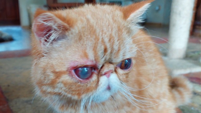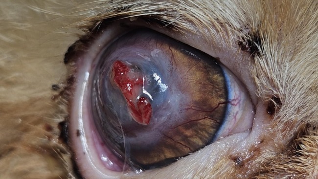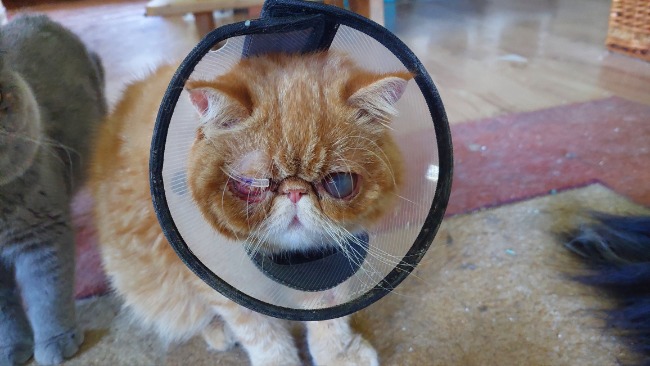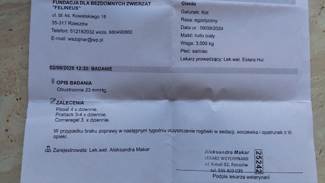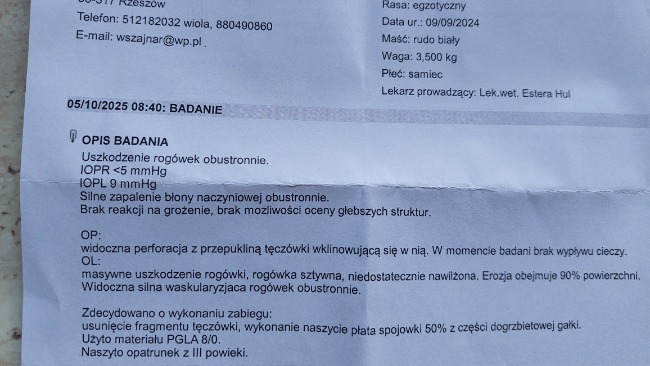 Niestety nie mamy dobrych informacji. W dniu 4.10, z powodu nie gojących się mimo leczenia owrzodzeń gałek ocznych, u Gienia doszło do perforacji prawego oka. Wytworzyła się szczelina rogówki, źrenuxa została wciągnięta do środka.