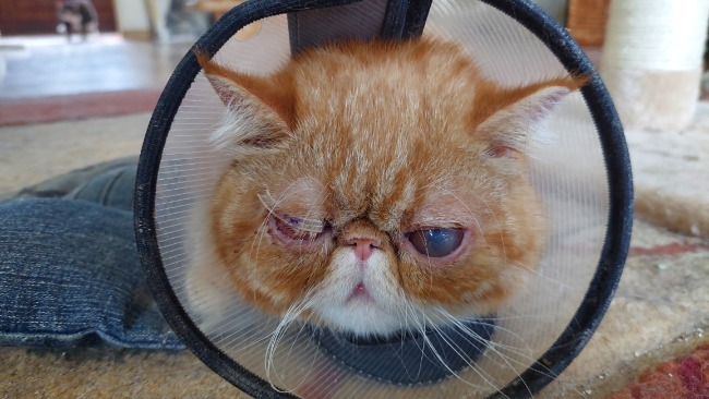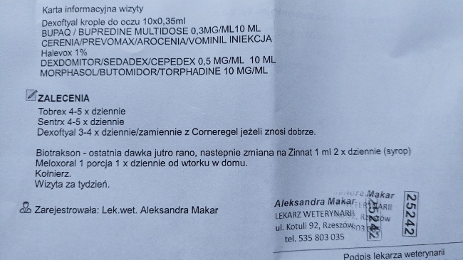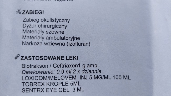 Oko zostało zakwalifikowane do usunięcia, ale pani weterynarz postanowiła o nie jeszcze powalczyć. Przepuklina została usunięta, źrenica przeszczepiona, a gałka oczna schowana pod opatrunkiem z 3 powieki. Musimy spróbować powalczyć, bo stan drugiego oka również nie jest dobry, przez co Gienio może całkowicie stracić wzrok.
