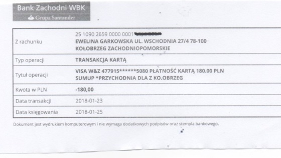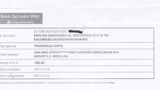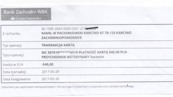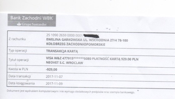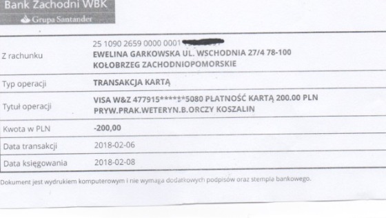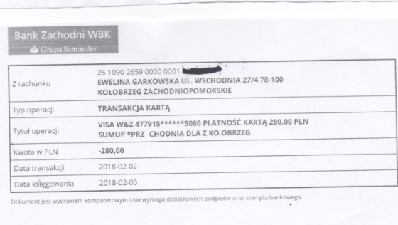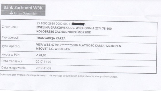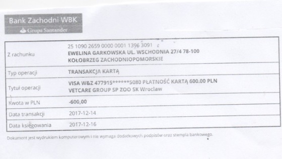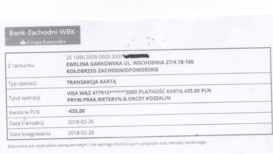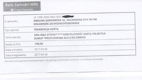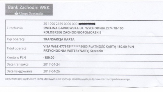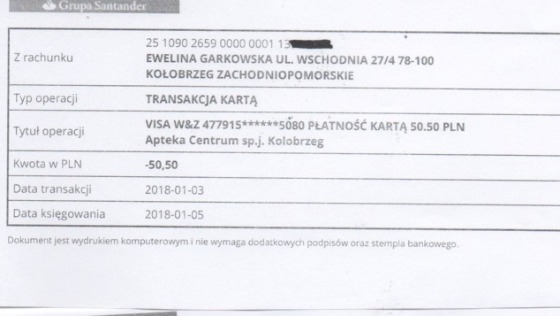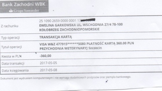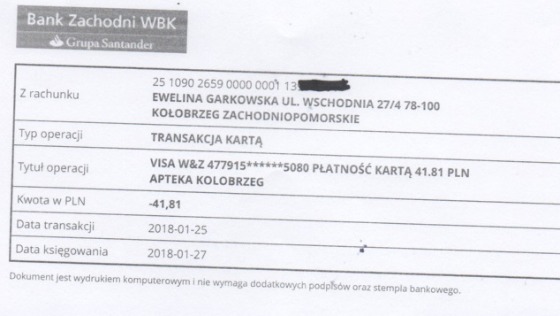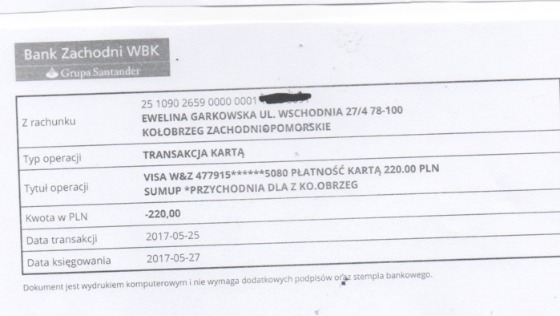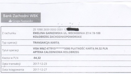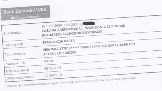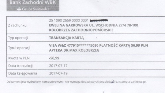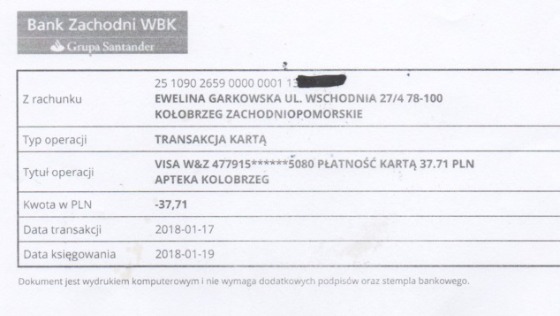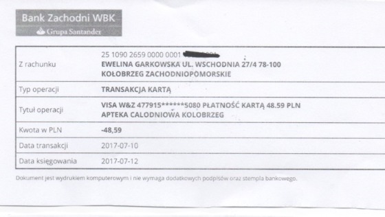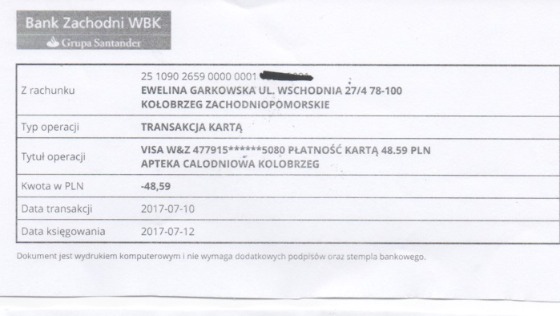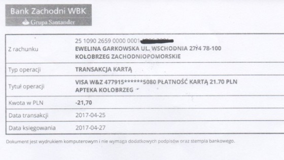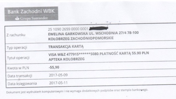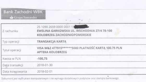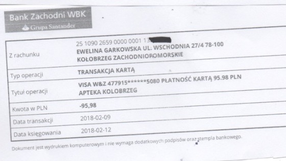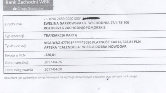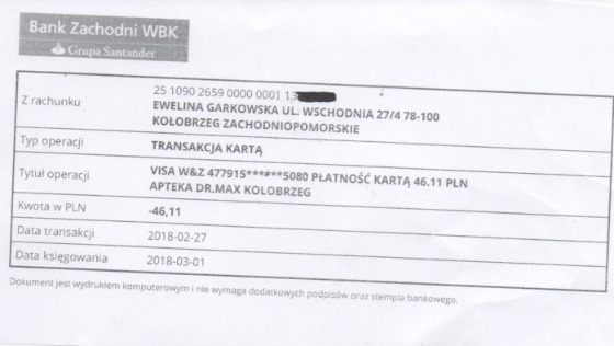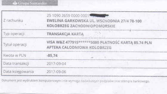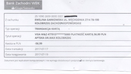 Przedstawiam potwierdzenia płatności w klinikach, płatności za leki, itp. Są to TYLKO i wyłącznie płatności które były wykonywane kartą. Jest jeszcze sporo płatności które były wykonywane za gotówkę, koszty dojazdów ( 8 wyjazdów z Kołobrzegu do Wrocławia) , (6 wyjazdów do Szczecina), ( 1 wyjazd do Warszawy), ( 1 wyjazd do Krakowa), ( 8 wyjazdów do Koszalina), ( nawet po lek Alkeran jechałam 200 km).