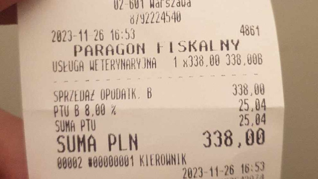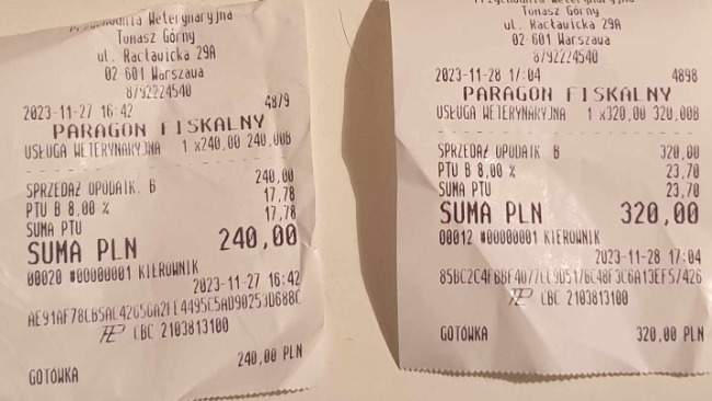 Dom tymczasowy świetnie się sprawuje i obie są wspaniale zadbane i zaopiekowane. Przedstawiam rachunki za wizyty: