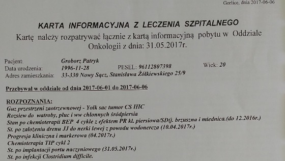 Witaj! Mam na Imię Patryk Groborz (l. 20) i choruje na złośliwy nowotwór: