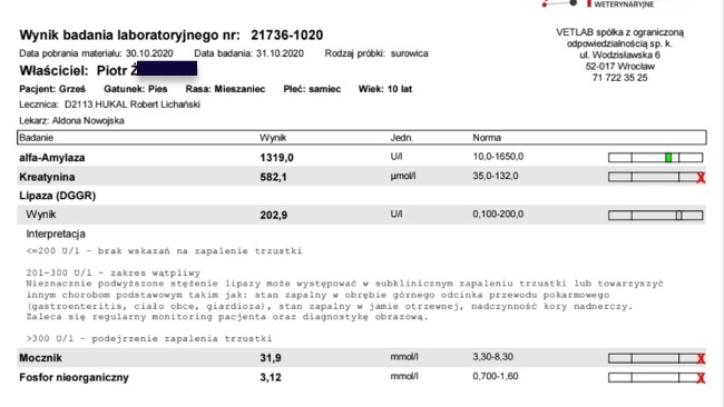 Niestety….w ostatnich tygodniach stan Grzesia poważnie się pogorszył. Po dokładnej diagnostyce sprawczynią niedyspozycji Grzesia okazała się Trzustka!!! Trzustka…….bardzo poważny organ nie tylko u ludzi. Grzesiek musi być kroplówkowany.Bierze antybiotyki i leki przeciwzapalne.Musi jesc karme specjalistyczna oraz przyjmować kreon. Obecnie Grzesiu przebywa pod opieką specjalistów, a na to potrzebne są środki pieniężne. Drodzy Państwo, teraz nie ratujemy zdrowia Grzesia lecz jego ….życie!!!!!