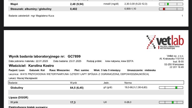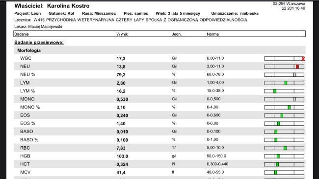 Leon jest już po 30 dniu leczenia na FIP. Wyniki krwi wskazują że leczenie działa. Nasz kotek czuje się znacznie lepiej widać to po badaniach i po jego zachowaniu. Na kontrolnym USG po guzie nie ma śladu, obraz znacznie lepszy niż na początku leczenia. Dużo lepiej również wygląda. Kotek przytył a to wiąże się ze zwiększeniem dawki leków które są również droższe. Koszty suplementów na wątrobę który musi przyjmować, badania kontrolne oraz USG są dla mnie bardzo wysokie, dziękuję wszystkim za dotychczasowe wpłaty i proszę o pomoc każdego kto jest w stanie chociaż trochę nas wspomóc.