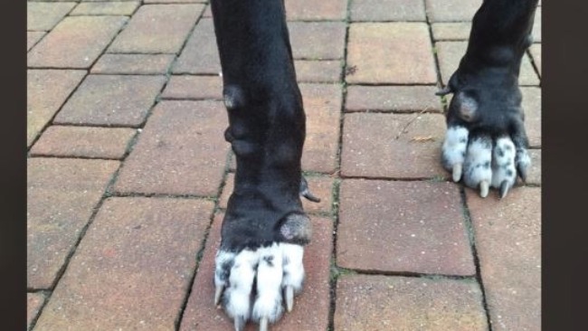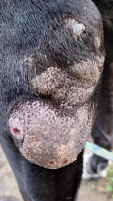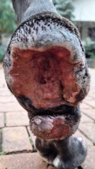 Jego nogi są pokryte guzami. Te na piętach pękły, rozpadły się i gniją.