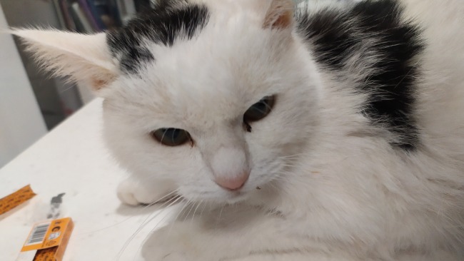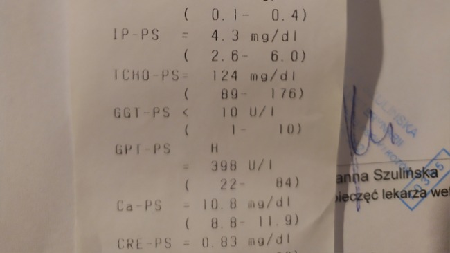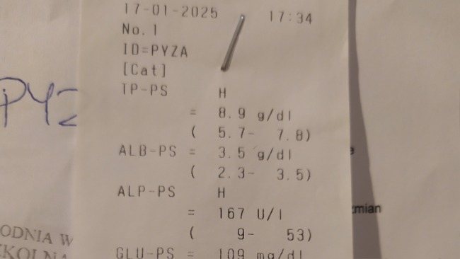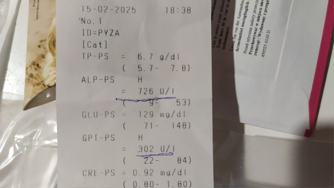Około miesiąc temu Pyza zaczęła się gorzej czuć, miała gorszy apetyt. W badaniach wyszły bardzo złe wyniki wątrobowe. Usg wykazało cechy stłuszczenie. Pyza dostaje Ornipural, leki przeciwzapalne i kroplówki. Od czasu rozpoczęcia leczenia dostawała również Hepatiale Forte. Przez trochę była poprawa, od dwóch dni znowu jest gorzej. Obecnie kotka ma żółtaczkę, jej stan jest określony jako bardzo poważny. Pyza nie je sama, jest karmiona strzykawką. Potrzebuję kupić dla niej odżywkę Nutribound. Bardzo możliwe, że konieczny będzie pobyt w szpitalu.