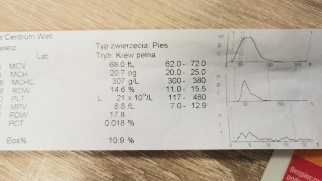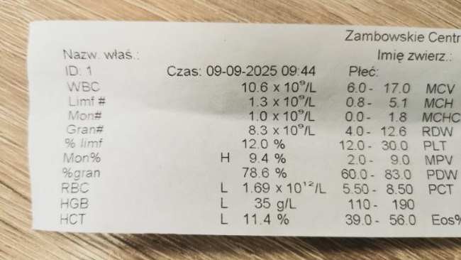 Hematokryt bardzo niski – piesek kwalifikuje się do przetoczenia krwi.