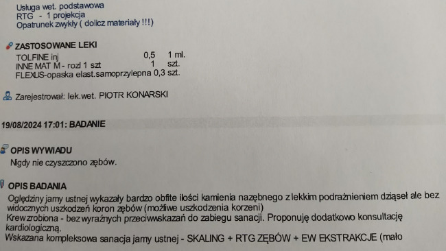 Operacja jest pilna bo kotek nie może już prawie jeść. Je bardzo niewiele, chudnie, marnieje. Widziałam stan zębów u stomatologa i jest tragicznie! Zapalenie dziąseł i ciemnożółty kamień na wszystkich tylnych zębach. Jest to gruba, zwarta warstwa, która narosła na zębach i zlała się w jedno tak, że nie widać ani zębów ani przerw między nimi! Kamień jest szorstki a miejscami ostry-rani miękkie części. Luka bolą zęby, które potrzebują pomocy specjalisty. Najpierw badania-krew i kardiolog. Później operacja sanacji i ekstrakcji. Za nami pierwsze koszty obowiązkowego badania i pobrania krwi oraz USG kwalifikacyjne. Wyniki krwi są ważne miesiąc. Do miesiąca musimy uzbierać pieniądze i zrobić zabieg.