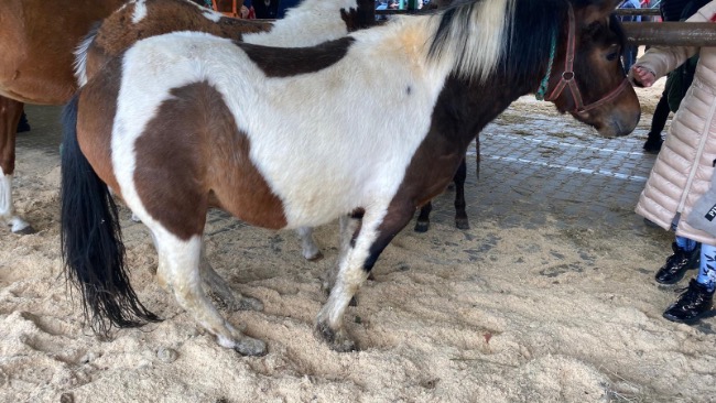 Mały, skrajnie wycieńczony konik. Obolały, przerażony. Stał wśród innych zwierząt, potykając się i ledwo utrzymując na nogach. Widać, że bardzo cierpi. Każdy krok sprawia mu ból.