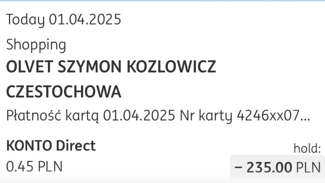 Bardzo prosimy o pomoc w spłaceniu rachunków weterynaryjnych, niestety za pierwszą wizytę nie pomyślałam i nie wzięłam faktury, dlatego mogę dodać jedynie zrzut ekranu z konta bankowego, ale za każdą następną wpłatę wezmę fakturę i będę tutaj dodawać jako potwierdzenie zapłaty.