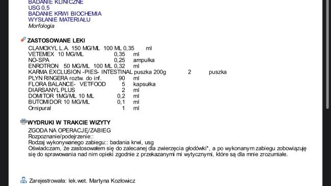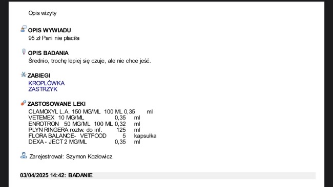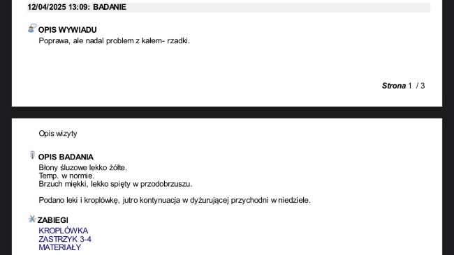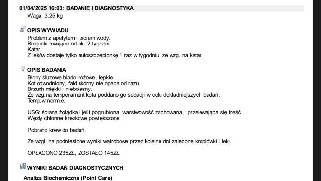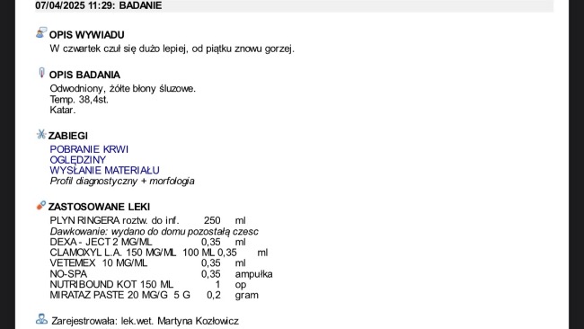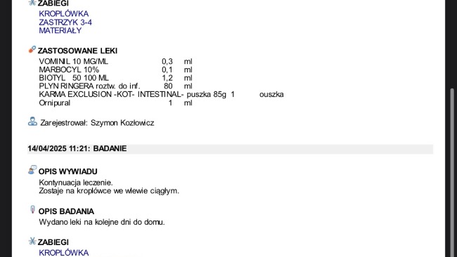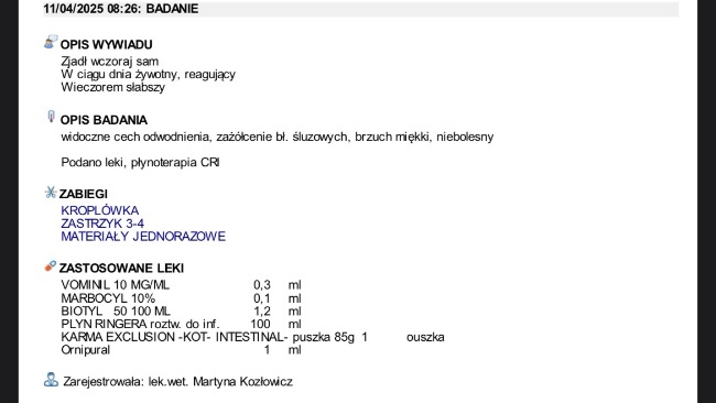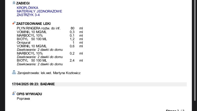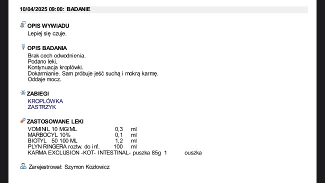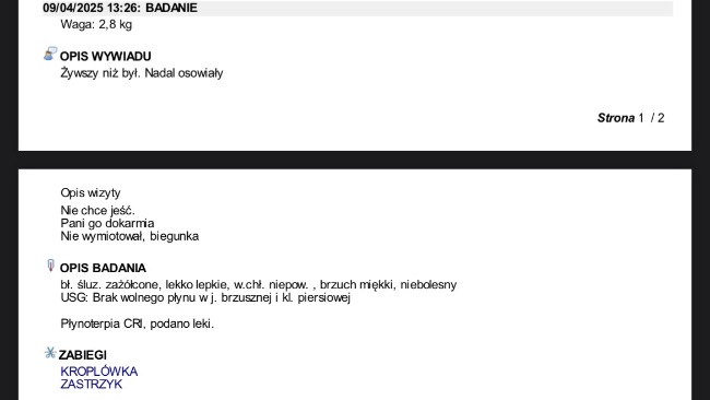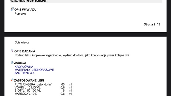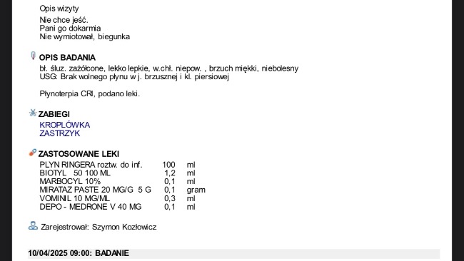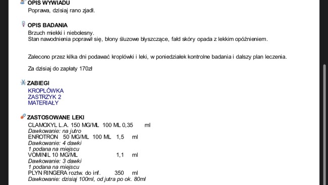 Obecnie z dnia na dzień umawiamy się na kolejne wizyty w celu podania leków oraz kroplówek, jutro otrzymam pełny wypis z trzech ostatnich wizyt gdzie wszystko będzie dokładnie opisane.