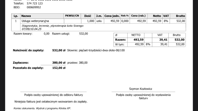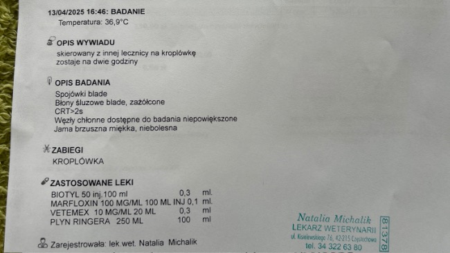 Czekamy nadal na fakturę oraz wypis z wizyty, Pani doktor przeprowadzi również symulację kosztów pod kątem hospitalizacji przez kilka dni. Niestety w domu nie mamy możliwości żeby dostawał kroplówkę dożylnie, ponieważ wyrywa sobie wenflon i była podawana podskórnie, ale w jego stanie to aktualnie nie wystarczy, dlatego czekamy na wycenę.