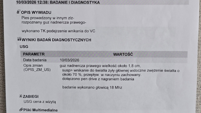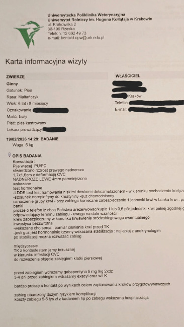W ostatnim czasie, podczas kontrolnej wizyty Ginny u weterynarza, opiekunowie usłyszeli druzgoczącą wiadomość: guz prawego nadnercza. Potem ujawniono jeszcze nieładne nacieki na żyłę główną (CVC) i wątrobę. W dodatku dokładne zdiagnozowanie, czy guz jest operacyjny okazało się bardzo trudne.