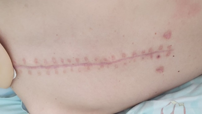 Stabilizacja przeznasadowa ze spondylodezą tylną VTh3 , VTh4,VTh5-VTh8,VTh9,VTh10(Expidium DePuy Synthes). Dekompresja kanału kręgowego laminektomią VTh6-VTh7. Rekonstrukcja worka oponowego. Rekonstrukcja opłucnej ściennej tylnej ściany klatki piersiowej na wysokości zwichnięcia.