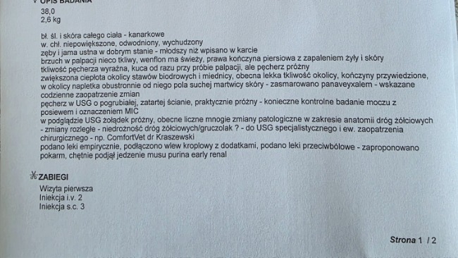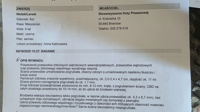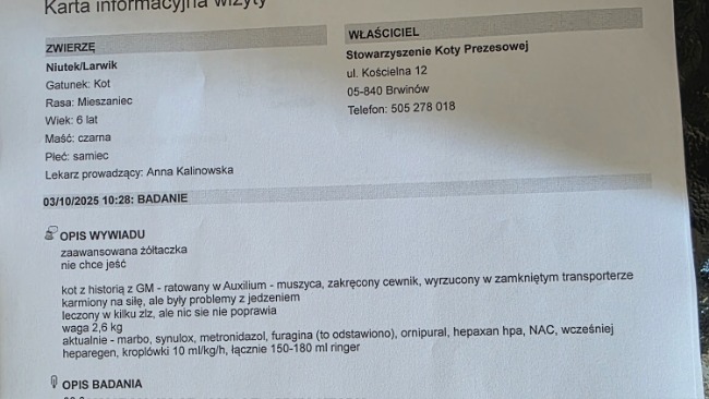 Dziś Niutek znów leży w lecznicy, wychudzony, żółty, z oczami, w których odbija się cierpienie. Ma zatkane drogi żółciowe, powiększony pęcherzyk żółciowy, żółtaczkę. Nie je, nie pije, umiera po cichu – jeśli nie podejmiemy decyzji natychmiast.