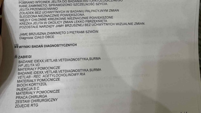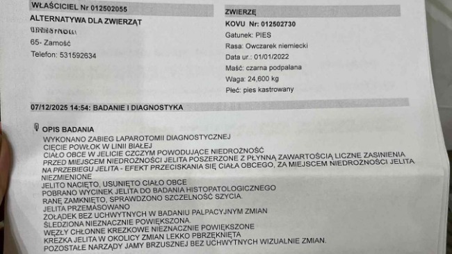 Wskutek operacji chirurgicznej zwiadowczej z jelita czczego Kovu lekarze wyciągnęli duże ciało obce, które mogło tam być nawet od miesiąca... Ciało obce nie było widoczne na żadnych badaniach obrazowych w żadnym z gabinetów, w których Kovu był przyjmowany. A RTG i USG robili specjaliści... To się niestety zdarza. Na szczęście Kovu od razu po operacji, pomimo bólu, poczuł się lepiej. Zaczął jeść i odzyskał humor, choć ma ograniczony ruch i dużo odpoczywa.