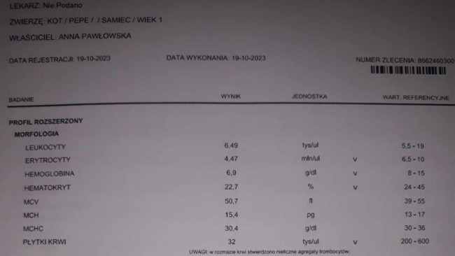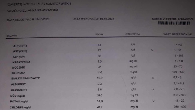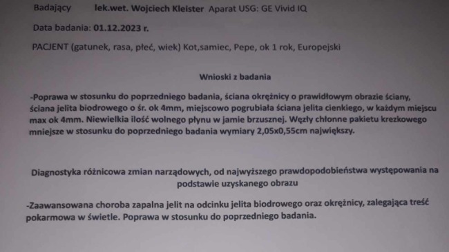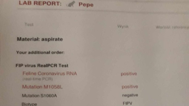 zgarnęłam go z osiedlowego podwórka. Były małe, brudne i z kiepską kondycją zdrowotną. Powoli zaczęły się oswajać, coraz lepiej czuć i jak to dzikie koty miały ogromny apetyt, a Pepe największy. Z całej trójki rodzeństwa zawsze był tym pierwszym przy miskach, do zabawy, do smakołyków i do miziania. Pewnego dnia z przebojowego, radosnego kociaka stał się osowiały, apatyczny i z dnia na dzień coraz bardziej smutny. Tracił apetyt i chęć do życia. Diagnoza nie była oczywista, bo Pepe chwilowo zaczynał reagować na leczenie antybiotykami. Niestety wyniki badań krwi były coraz gorsze. Kiedy pojawił się płyn w jamie brzusznej niezwłocznie został pobrany i wysłany do labolatorium - diagnozą jest FIP. Pepe 1/3 leczenia ma już za sobą. Czuje się znacznie lepiej, wrócił mu apetyt, zainteresowanie wszystkim dookoła, wyniki krwi są zdecydowanie lepsze, obraz usg również pokazuje poprawę w porównaniu do poprzedniego badania. Walkę z FIPem podjęliśmy od razu i bez jakiegokolwiek zastanowienia, jednak koszty leków oraz wszelkich potrzebnych badań i wizyt nas przerosły i bardzo prosimy o pomoc we wsparciu dalszego leczenia naszego dzielnego kota.