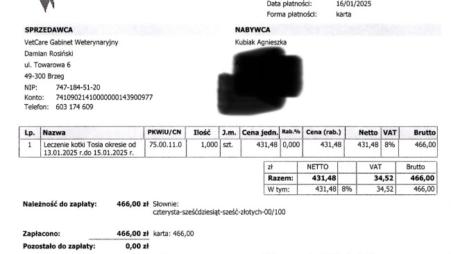 Ostatnie faktury za małą…resztę wpłaciliśmy na konto innego chorego kotka na FIP…jeszcze raz dziękujemy,że byliście z nami