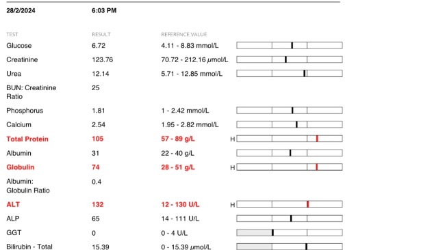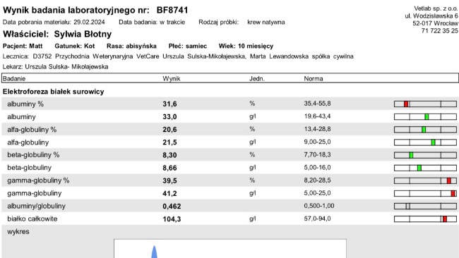 Witamy wszystkich. Prosimy Was o pomoc w leczeniu naszego kotka Matta, siedmiomiesięcznego pełnego radości szkraba, który ma całe życie przed sobą. Od kilku dni Matt stał się bardzo smutny, apatyczny, przestał biegać i się bawić, nie miał apetytu, a właściwie w ogóle nie jadł, bardzo schudł (do 2,2 kg). W brzuszku wyczuliśmy coś dużego. Z myślą, że to ciało obce udaliśmy się do weterynarza, aby dowiedzieć się co mu dolega. Już pierwsze badania wykazały bardzo silny stan zapalny całego organizmu, ciało obce okazało się wielkim węzłem chłonnym o wielkości 4 cm, Diagnostyka potwierdziła ciężką chorobę, niejednokrotnie śmiertelną - zakaźne zapalenie otrzewnej oraz żółtaczkę (załączam wyniki badań).